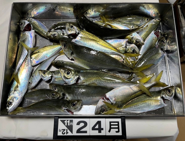 想像どおり、暗くなって電気ウキが見え始めるころに時合がスタート。鯵釣りは知らぬ間に4〜5人が並んでいた。まずは大きめのアジが釣れて、その後時間が経つにつれてサイズが徐々に小さくなる独特の流れ。よその釣り場も似たものだが途中で大・小が入り交じることもある。ここの特徴は“時間軸で明らかにサイズダウンしていく点だろう。